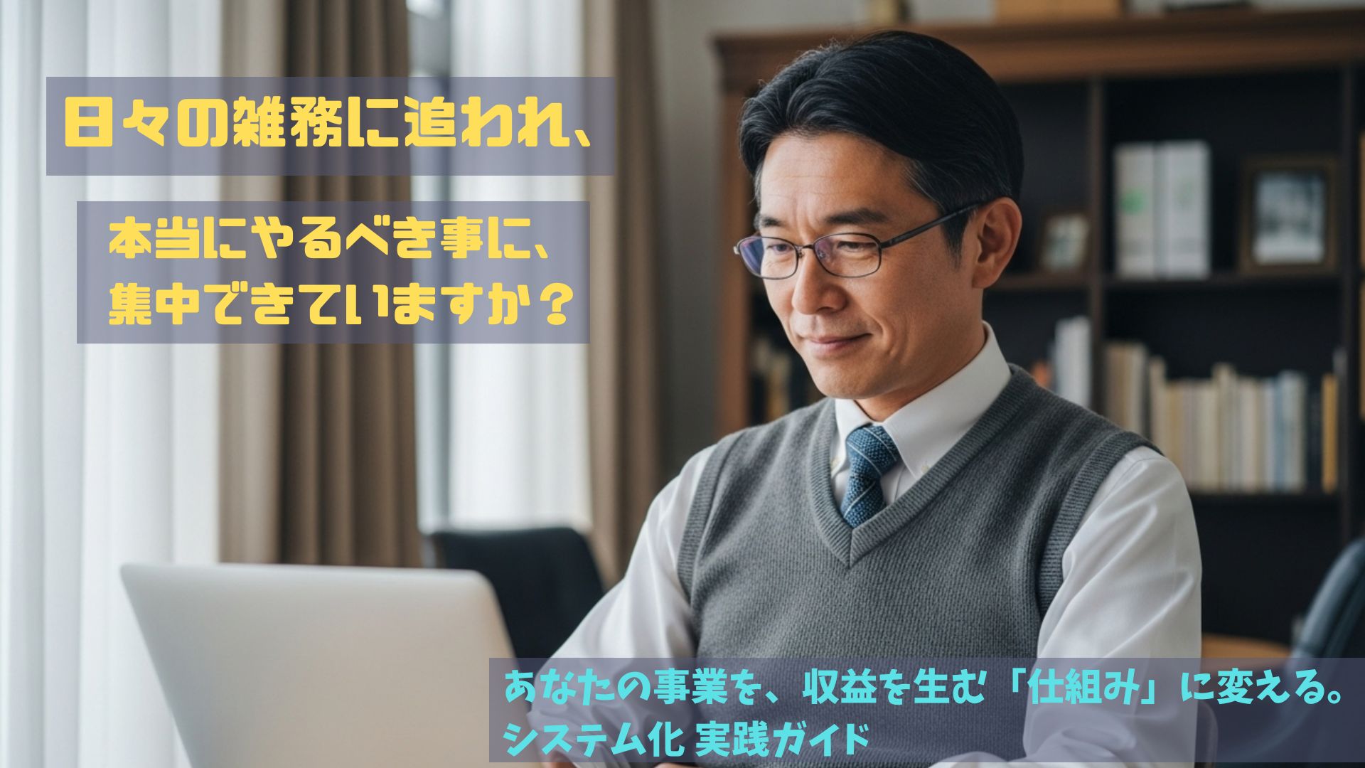 >あなたの貴重な時間と経験を、単純作業に費やすべきではありません。AI、ノーコード、自動化ツールを駆使し、事業を「システム」として再構築することで、あなたは本来の創造的な仕事に集中できるようになります。このサイトは、そのための具体的な技術とノウハウを提供します。
