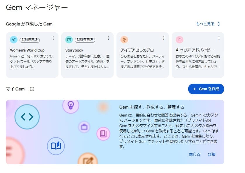 GoogleのGeminiでも、同様の機能「Gems(ジェム)」が利用可能です。