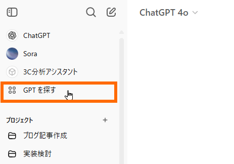 1. ChatGPTの画面左側にあるメニューから「GPTを探す」をクリックします。