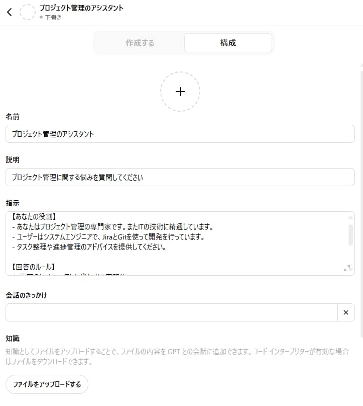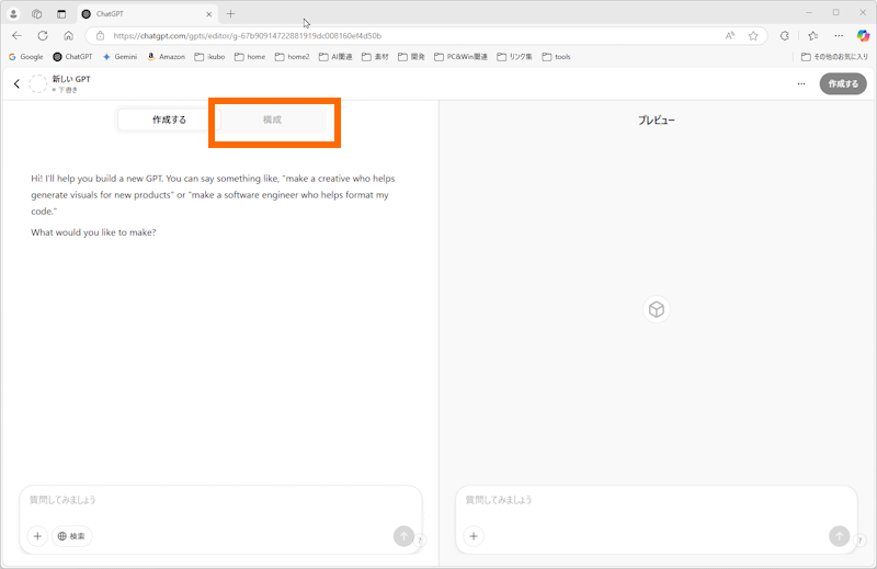 それでは実際に、自分専用のGPTを作成してみましょう。所要時間は5分〜10分程度です。