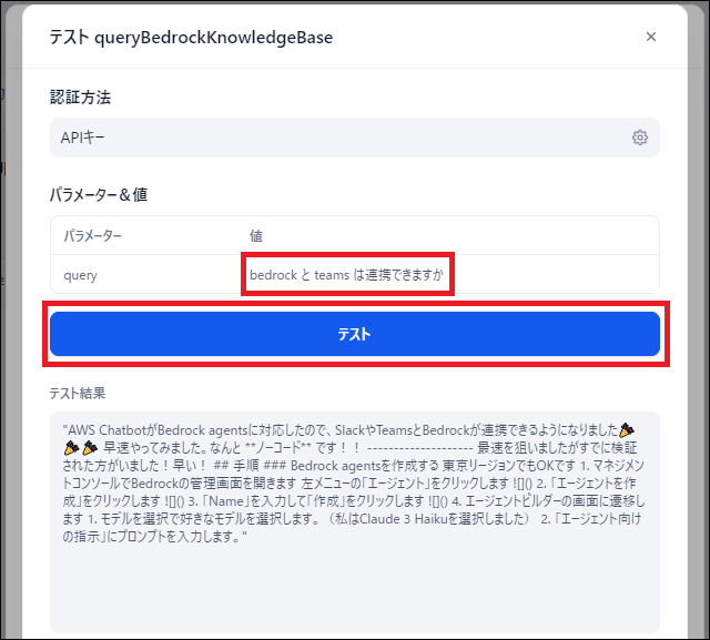 設定後、「テスト」ボタンを押して実際にAPIが動作するか確認します。「bedrock と teams は連携できますか」などのクエリを送信し、検索結果が返ってくれば成功です。
