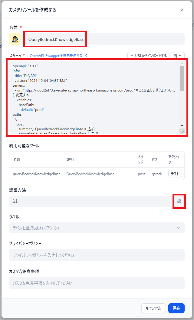 「ツール」タブから「カスタムツールを作成」を選択し、以下のOpenAPIスキーマを入力します。これにより、Difyが外部API(Amazon API Gateway等で構築したBedrock検索API)を呼び出せるようになります。
