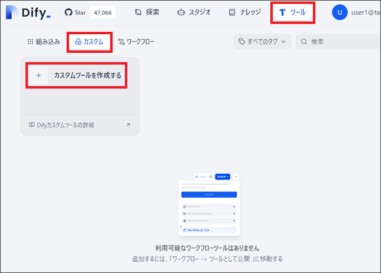 外部のナレッジベース(ここではAmazon Bedrock Knowledge Base)を検索するために、Difyの「カスタムツール」機能を使用します。
