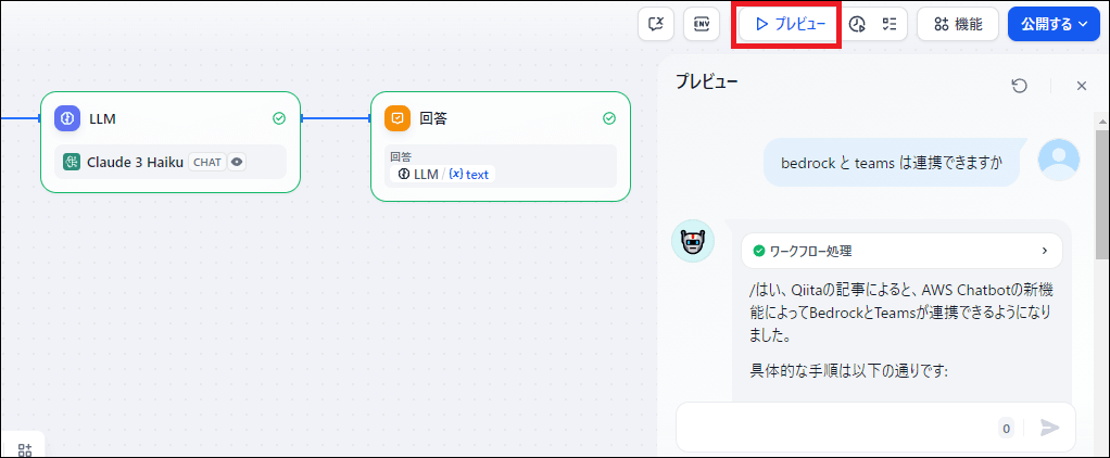 プレビュー画面で再度質問を投げてみます。今回は外部のナレッジベースを検索し、その内容に基づいた回答が生成されているはずです。
