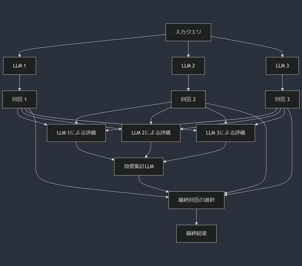 - 評価・投票フェーズ: 各LLMは、自分以外のモデルが生成した回答を読み、「論理性」や「正確性」などの観点で評価し、最も優れているものに投票します。