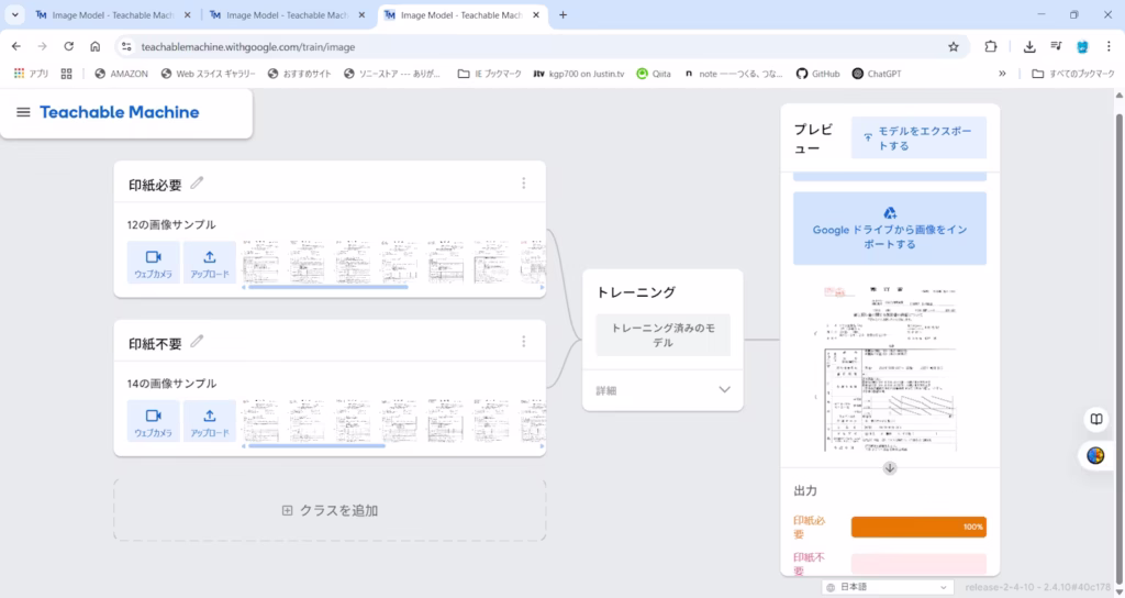 Teachable Machineを開き、「画像プロジェクト」を作成。「収入印紙要」「収入印紙不要」の2つのクラスを作成し、用意した画像をアップロードしてトレーニングを実行します。