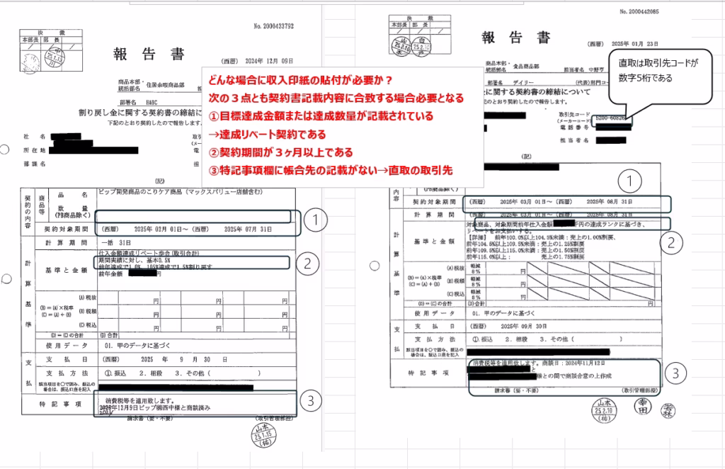 達成リベート契約などは印紙税法上の「第7号文書」に該当し、4,000円の収入印紙が必要となるケースがあります。しかし、現場担当者がこのルールを完全に把握するのは難しく、提出された契約書を管理部門が一件ずつ目視で再チェックしているのが現状でした。