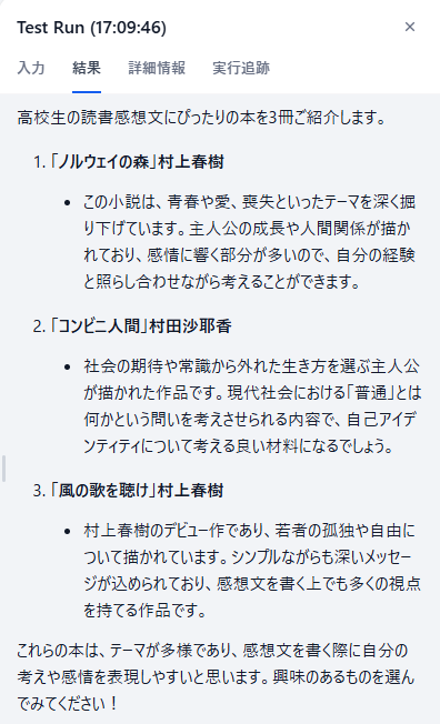 最後に「終了(End)」ノードを追加し、LLMの出力結果を表示するように設定します。