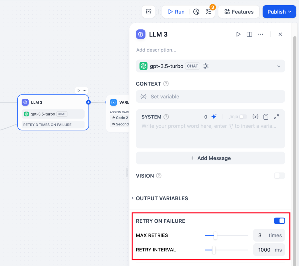 エラー処理:異なるエラー対応戦略を提供し、現在のノードが失敗してもメインプロセスを止めずにエラー通知を行うか、バックアップ経路を使ってタスクを継続できるようにします。詳細は、エラー処理をご覧ください。構造化された出力: LLM が返すデータ形式の可用性、安定性、予測可能性を高め、エラー処理や形式変換の手間を削減します。