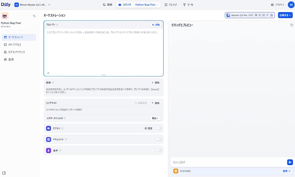 Difyを使えば、特定の用途に特化したAIアシスタントを簡単に作成できます。今回はPythonのバグ修正に特化させましたが、プロンプトを変更するだけで「JavaScriptのコード変換」や「SQLの最適化」など、様々なエンジニアリング業務に応用可能です。