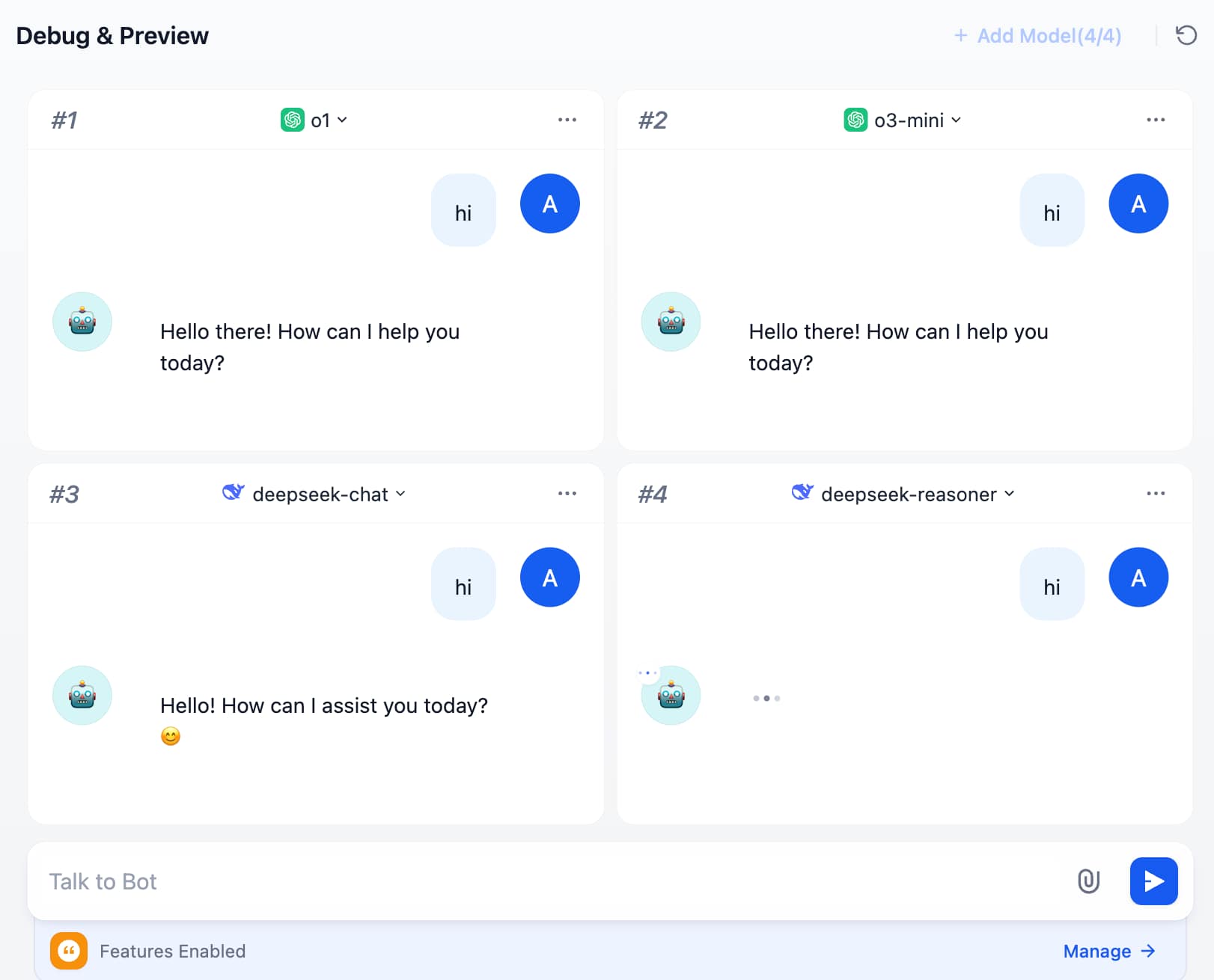 Difyのチャットボットアプリでは、1つの質問に対して、最大4つの異なるLLMからの回答を同時に生成・表示することができます。