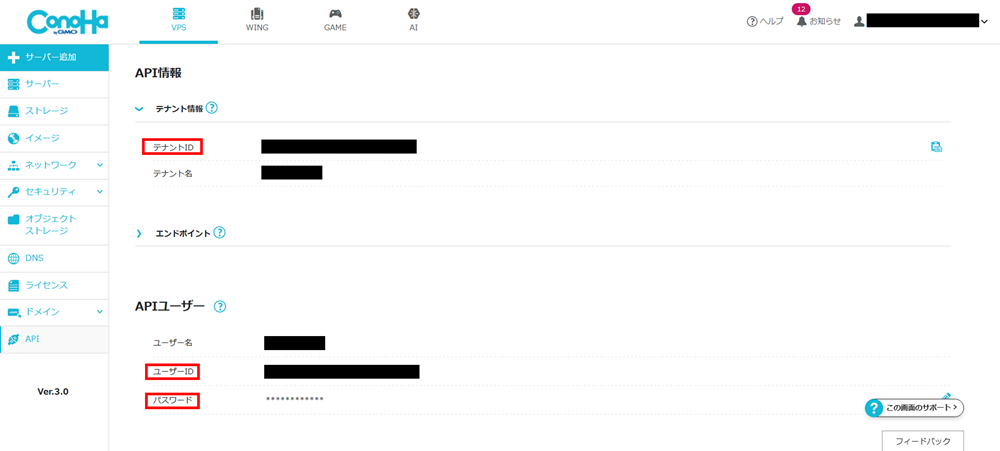 各値はConoHaコントロールパネルのAPI設定で確認できます。