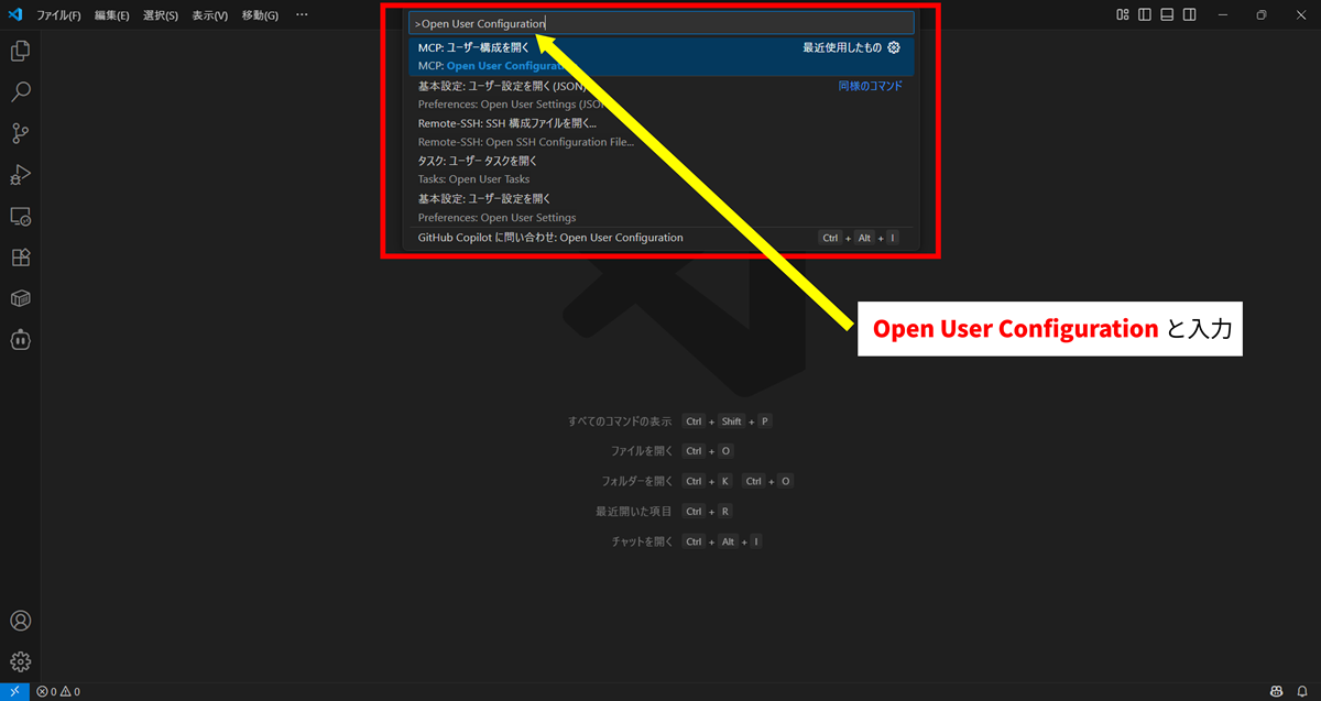 VSCodeの設定ファイル(mcp.json)に以下の記述を追加します。