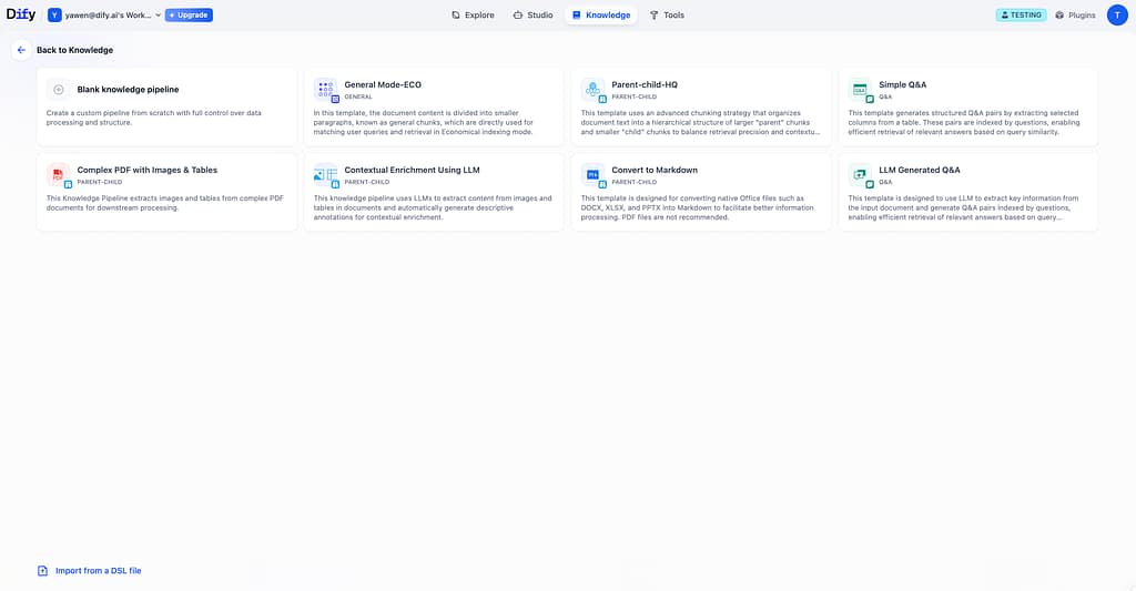 これまでのDifyのナレッジ機能は「ファイルをアップロードして終わり」というシンプルなものでした。v2.0のナレッジパイプラインは、データの取り込みから加工、保存までの工程をノードベースで自由に設計できる機能です。