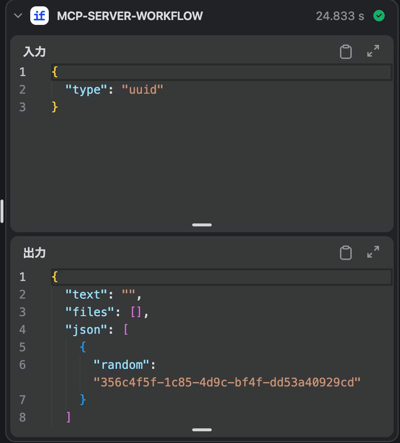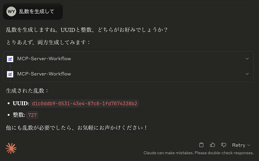これで、Claudeとのチャット中に「乱数を生成して」「社内規定を検索して」と指示すると、Difyのワークフローが裏側で実行され、その結果がClaudeに返されるようになります。