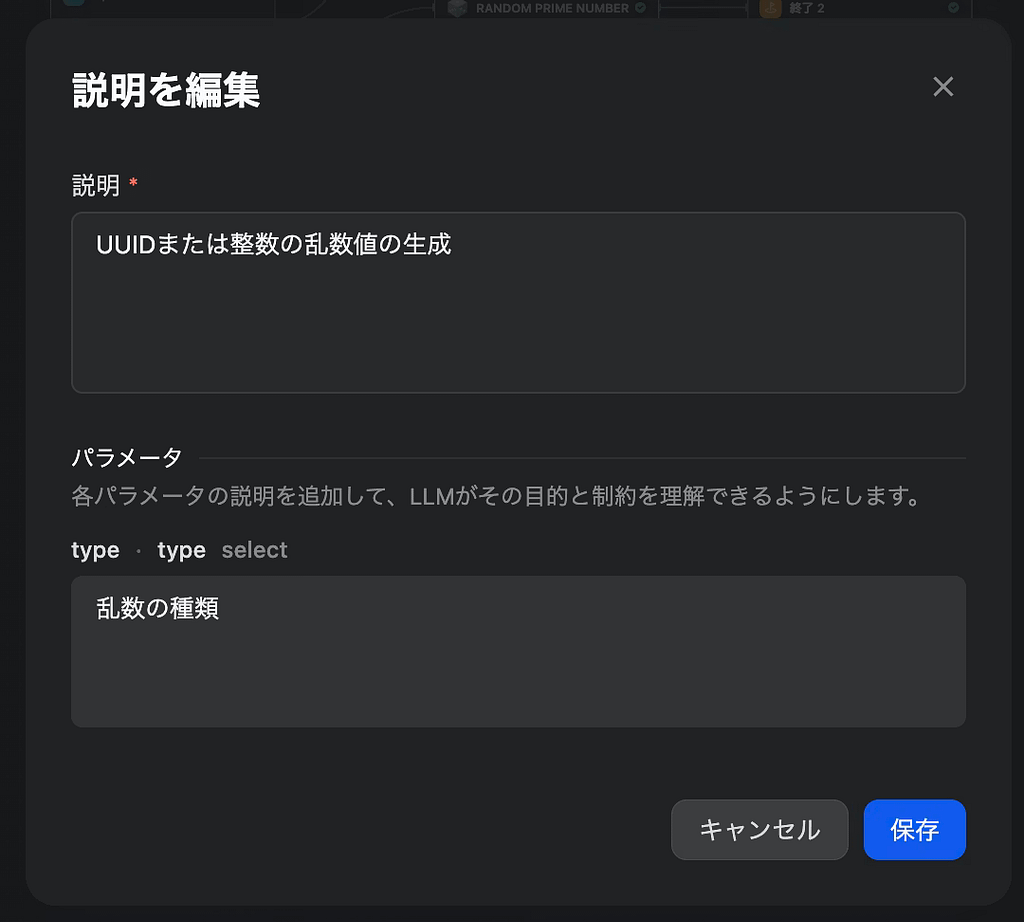 3. ツールの説明: 開始ノードに入力フィールドがある場合、それぞれのフィールドに説明文(Description)を追加します。これは外部AIがツールを正しく使うためのヒントになります。