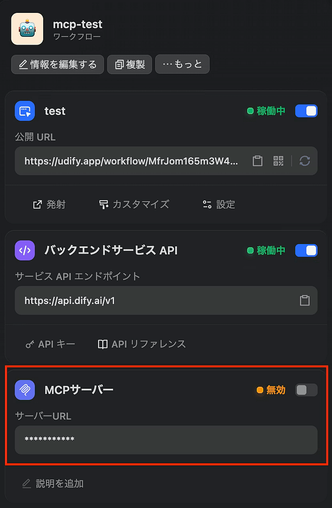 Difyで作成したワークフローやチャットフローを、外部のAI(Claude Desktopなど)から「ツール」として呼び出せるようにします。