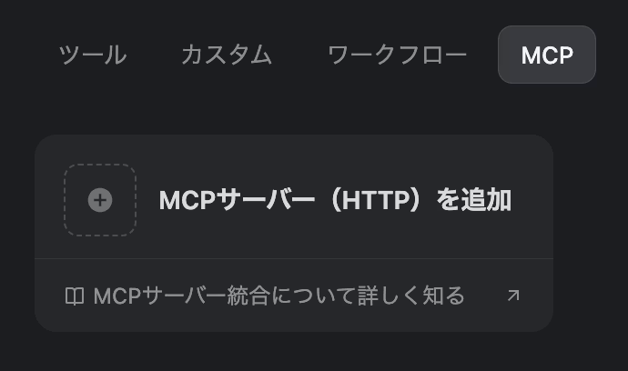 Difyのトップ画面から「ツール」タブを開き、「MCP」→「MCPサーバー(HTTP)を追加」を選択します。ここで利用したいMCPサーバーのURLを登録します。