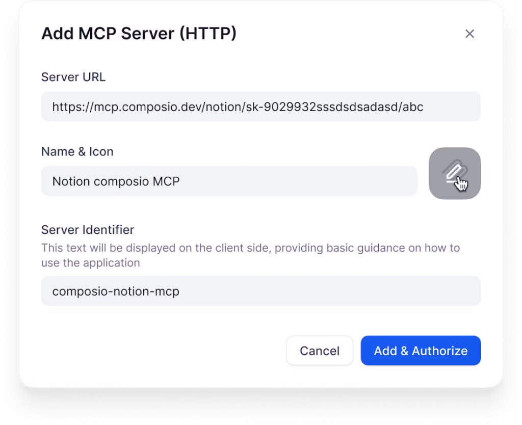 https://api.example.com/mcp/sse) - 名前・アイコン: Dify内で表示される名称です。
