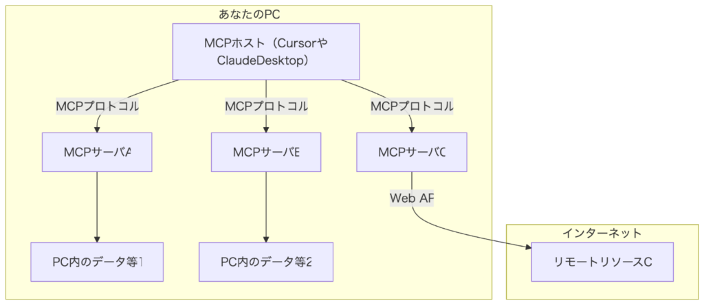 - MCPホスト (Host): ユーザーが操作するAIアプリ(例:Cursor, Claude Desktop)。指示を受け付け、MCPサーバーに処理を依頼します。