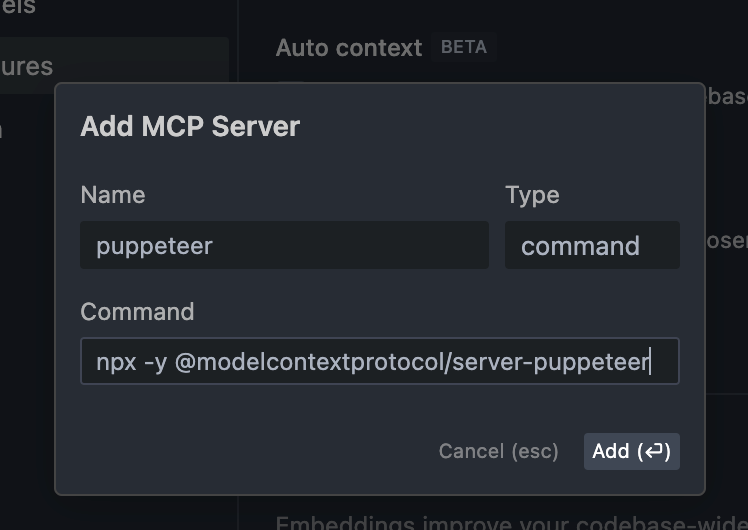 「Add new MCP server」をクリックし、以下のように入力します。