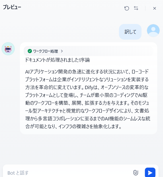 Difyの「File Translation(ファイル翻訳)」テンプレートは、ファイルをアップロードして翻訳するだけでなく、ユーザーとの対話を通じて翻訳の質を向上させる高度なチャットフローです。