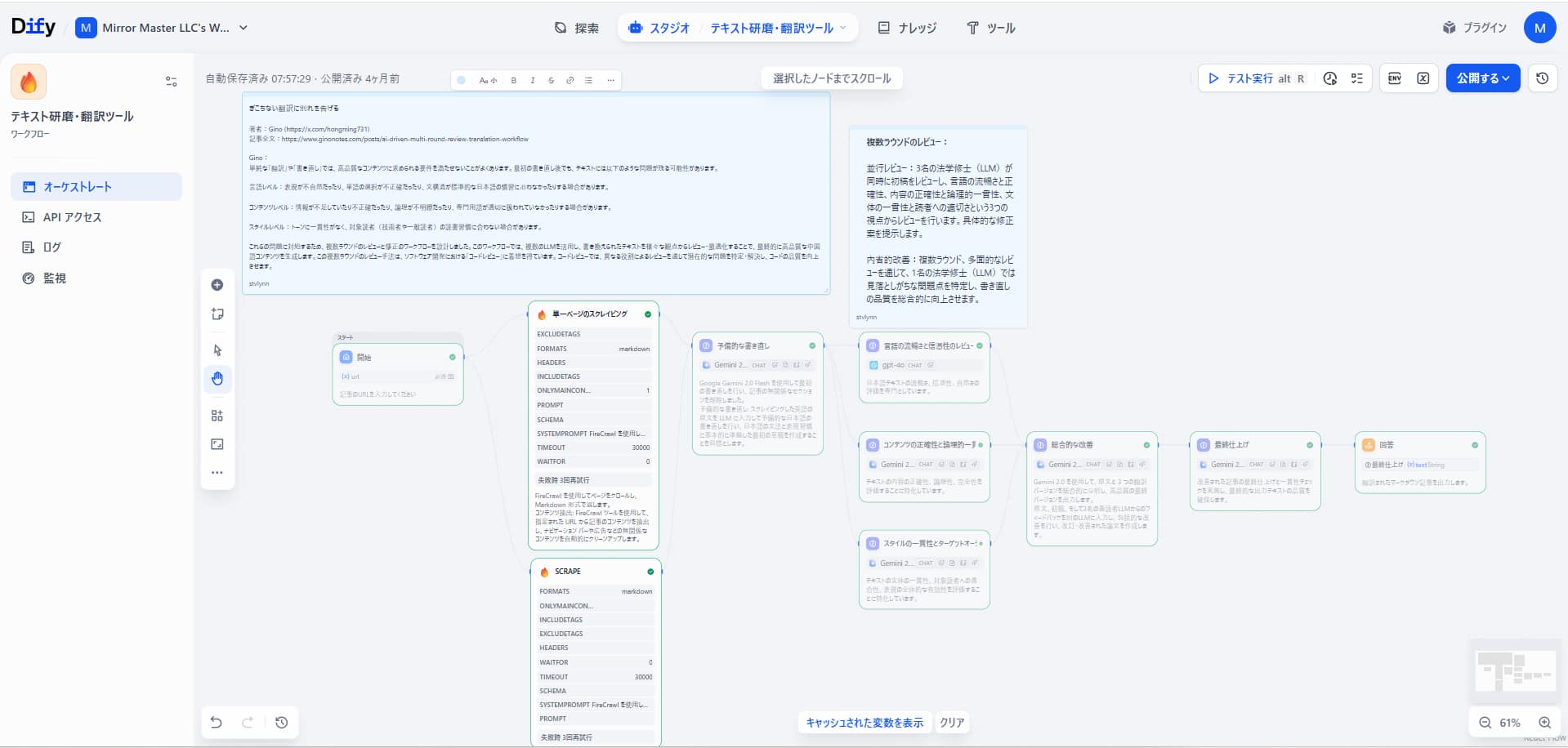 このワークフローは、「予備翻訳」→「3つの視点からのレビュー」→「総合的な改善」→「最終仕上げ」という4段階のプロセスを経て、テキストを生成します。