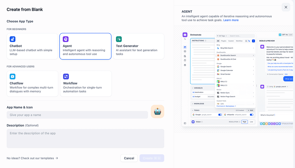 - Difyで「最初から作成」を選び、「エージェント」タイプを選択します。