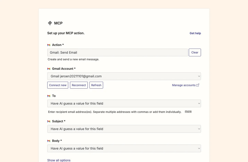 ここで重要なのが、各フィールド(To, Subject, Body)の設定です。すべて「Have AI guess a value for this field(AIに値を推測させる)」を選択してください。
