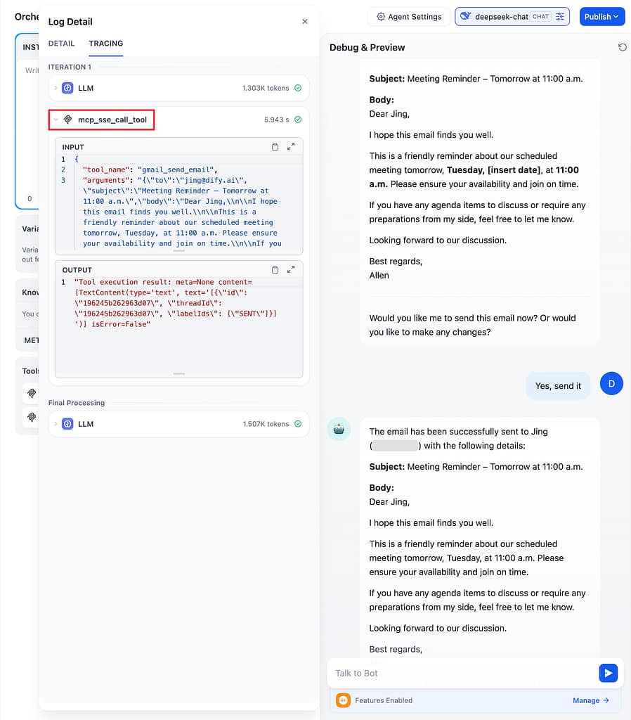 これにより、Dify側のAIが会話の流れを読んで、宛先や件名を自動的に埋めてくれるようになります。