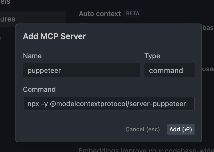 - Cursorを開き、設定(歯車アイコン)→「Features」→「MCP」へ移動します。