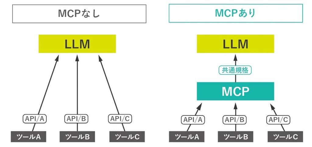 これまでは、Googleドライブと連携するにはGoogleのAPI、Slackと連携するにはSlackのAPIに合わせて、それぞれ個別にプログラムを書く必要がありました。しかしMCPを使えば、USBケーブルを挿すように、規格に合ったツールであれば即座にAIエージェントに接続できるようになります。