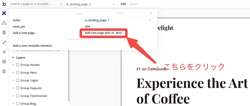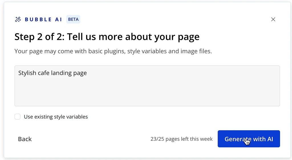 Bubbleのエディタ画面で「Add a new page」を選択し、「Generate with AI」タブをクリックします。