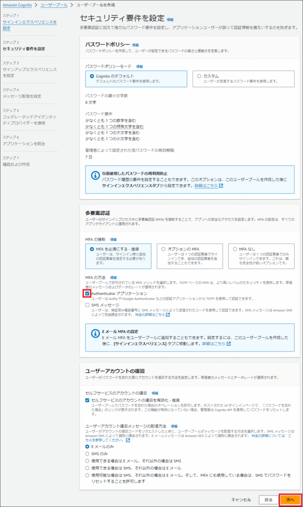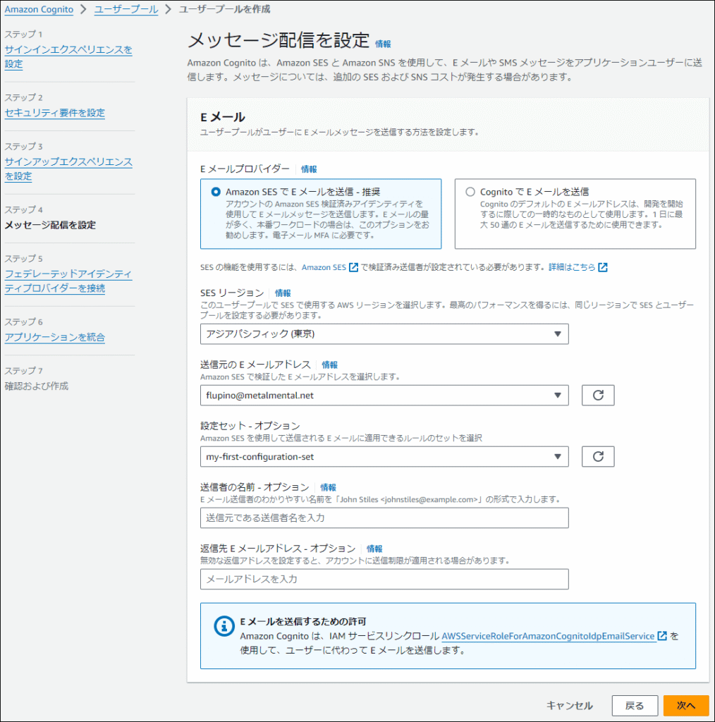 次に、認証基盤となるCognitoユーザープールを作成し、ALBと連携させます。