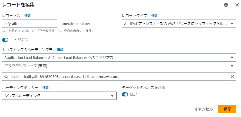 AWSコンソールからALBを作成します。ターゲットグループには、バックエンドとなるサーバー(例: Difyが稼働するEC2インスタンス)を指定します。