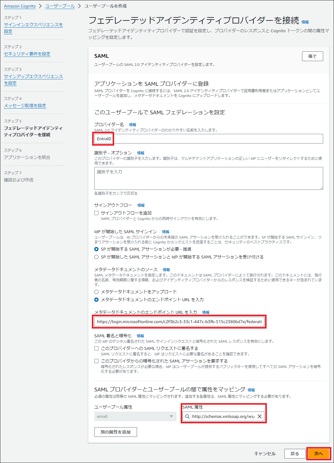 - 属性マッピング: Entra IDから取得するEメールアドレスをCognitoの属性にマッピングします。SAML属性には以下を設定します。
