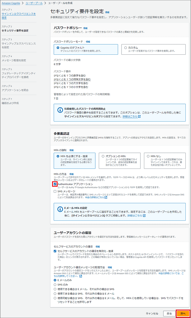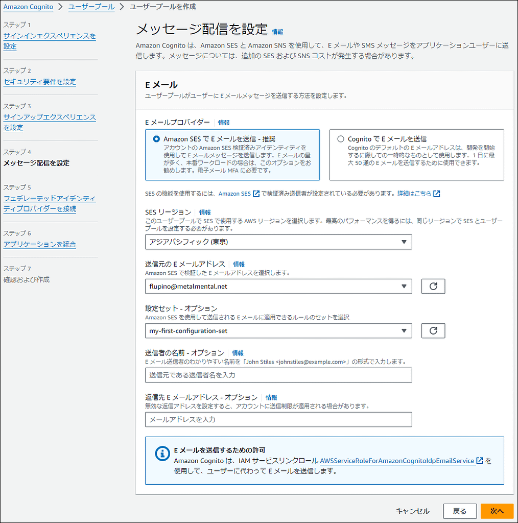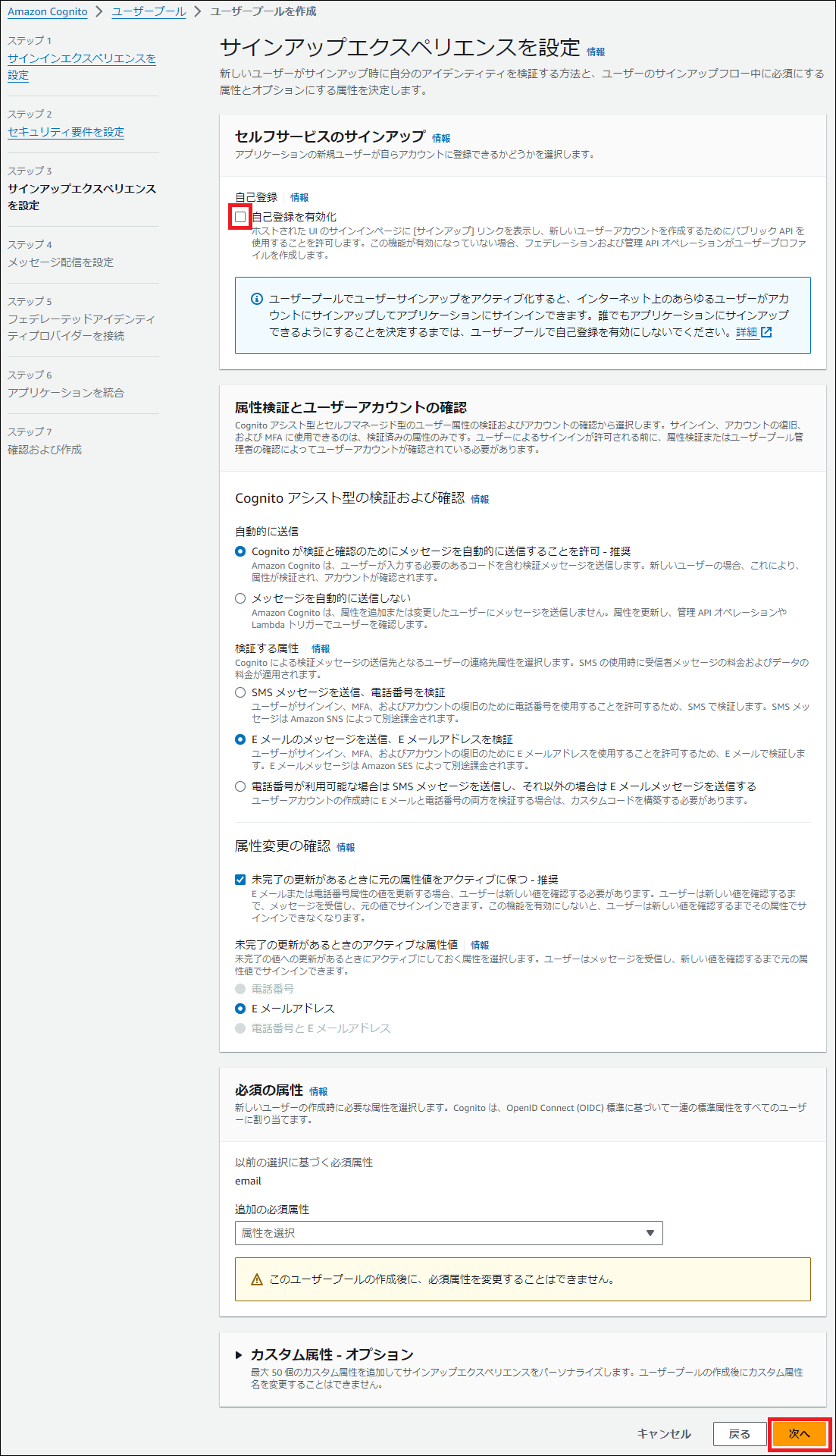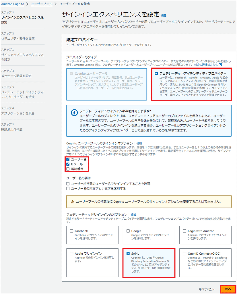 Cognitoコンソールから「ユーザープールの作成」を選択します。サインインオプション(Eメール、ユーザー名など)や、パスワードポリシーを設定します。