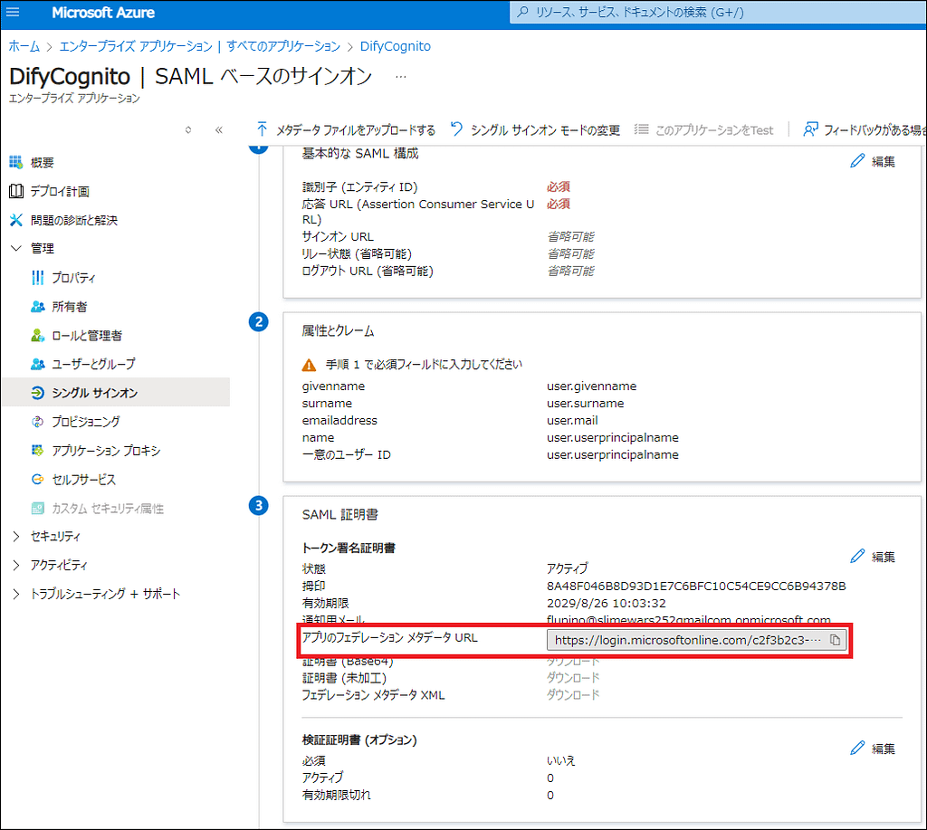- メタデータの登録: Azure側で発行された「フェデレーション メタデータ URL」をCognitoに入力します。