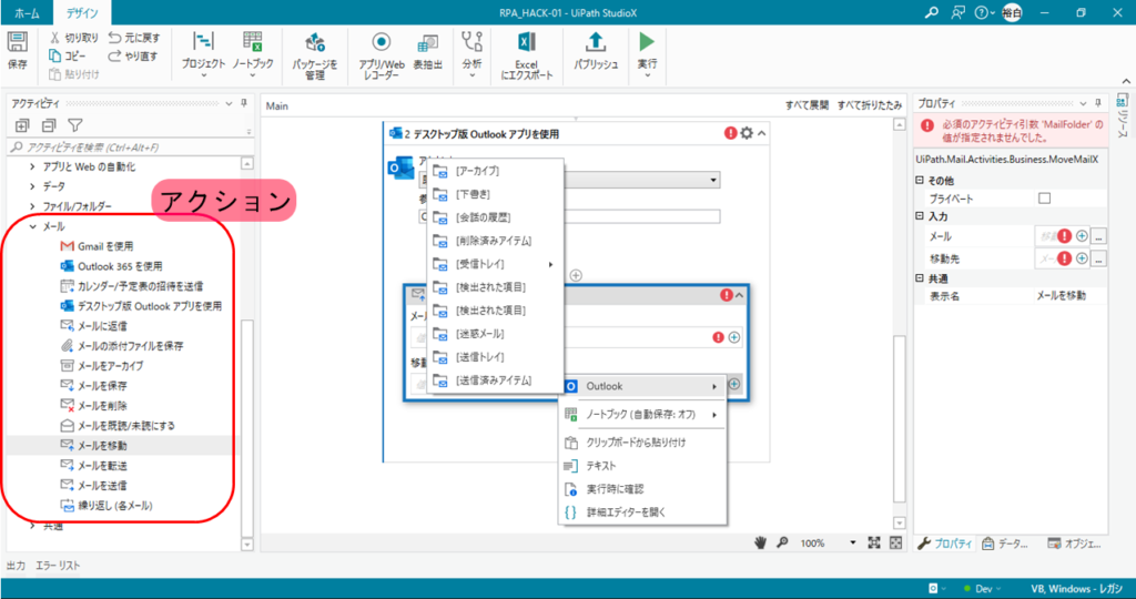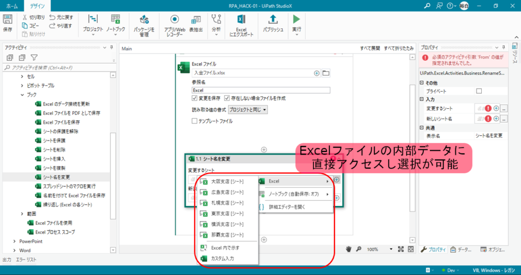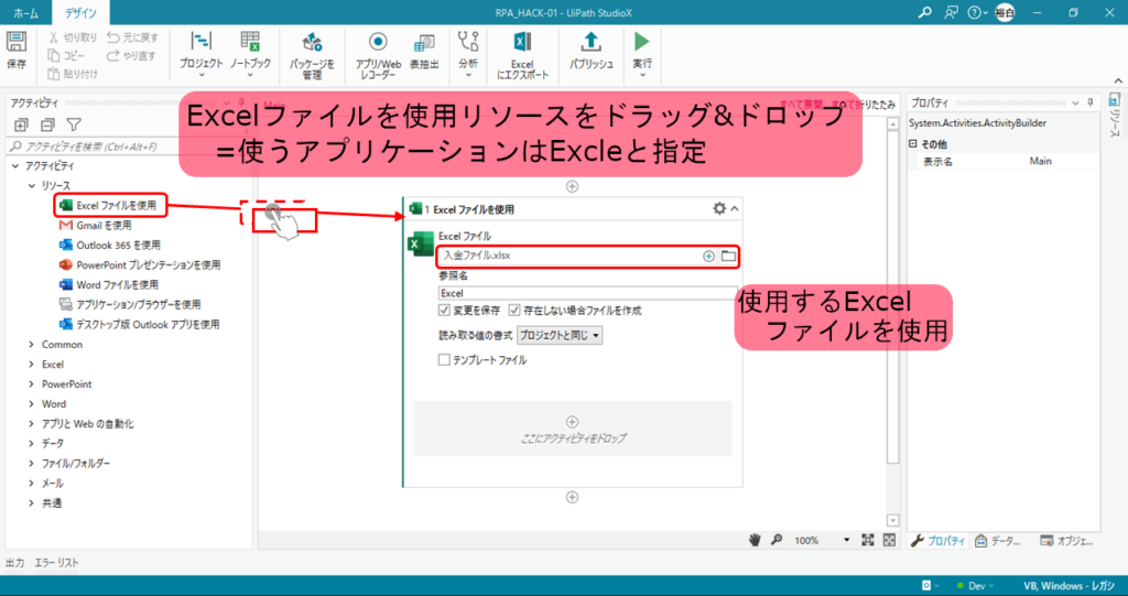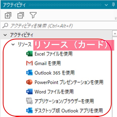 - データの連携: リソースを配置することで、そのファイルの中身(Excelのシート名やOutlookのフォルダー名など)をロボットが認識できるようになります。