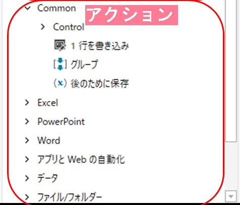 リソース(カード)の中に配置する、具体的な「動作」のパーツがアクションです。