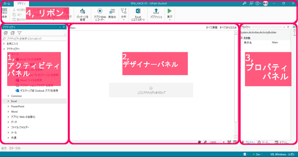 まずはStudioXを起動した際に見る画面の名称と役割を覚えましょう。