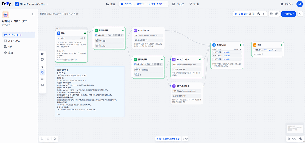 ECサイトやサービスにお客様からのレビューが届いたとき、その内容を確認し、担当部署に振り分ける作業に多くの時間を費やしていませんか? Difyの「Customer Review Analysis Workflow(顧客レビュー分析ワークフロー)」テンプレートは、LLM(大規模言語... -