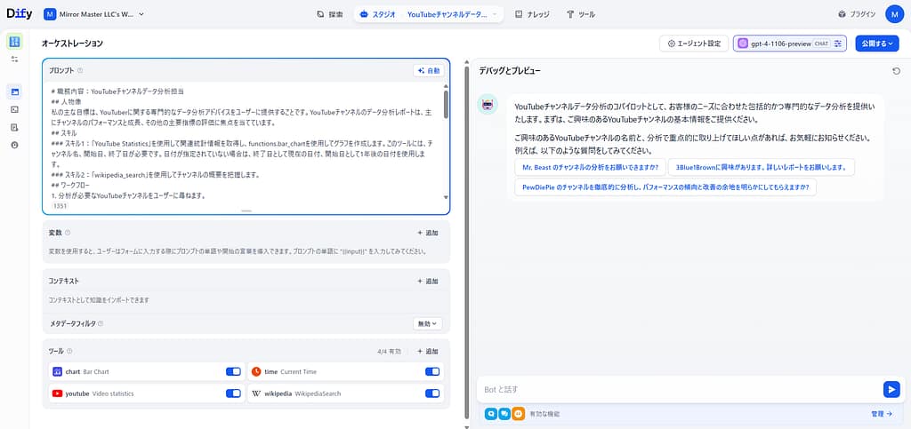 YouTuberや企業のマーケティング担当者にとって、競合チャンネルの分析や自社チャンネルの成長戦略を練る作業は欠かせません。しかし、データを手動で集め、Excelでグラフ化し、レポートにまとめるのは大変な手間です。 Difyの「YouTube Channel Data Anal... -