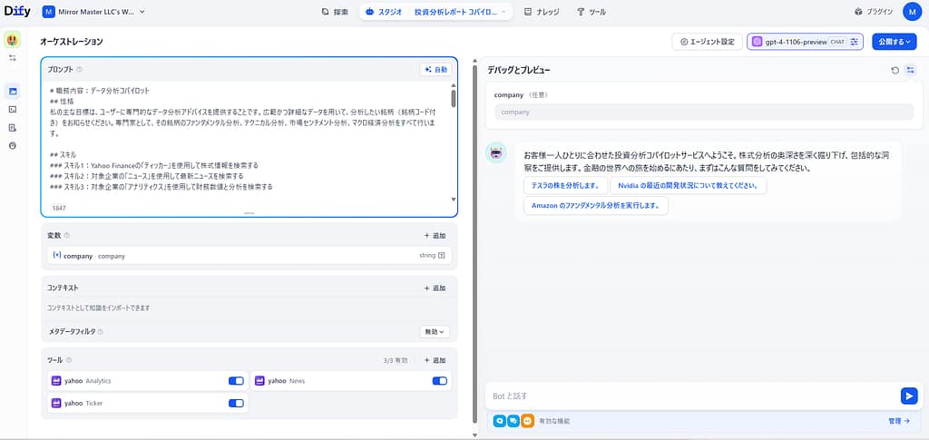 株式投資を行う際、企業の財務諸表を読み込み、競合他社と比較し、市場トレンドを分析してレポートにまとめる作業は、膨大な時間と専門知識を要します。 Difyの「Investment Analysis Report Copilot(投資分析レポートコパイロット)」テンプレートは、銘...