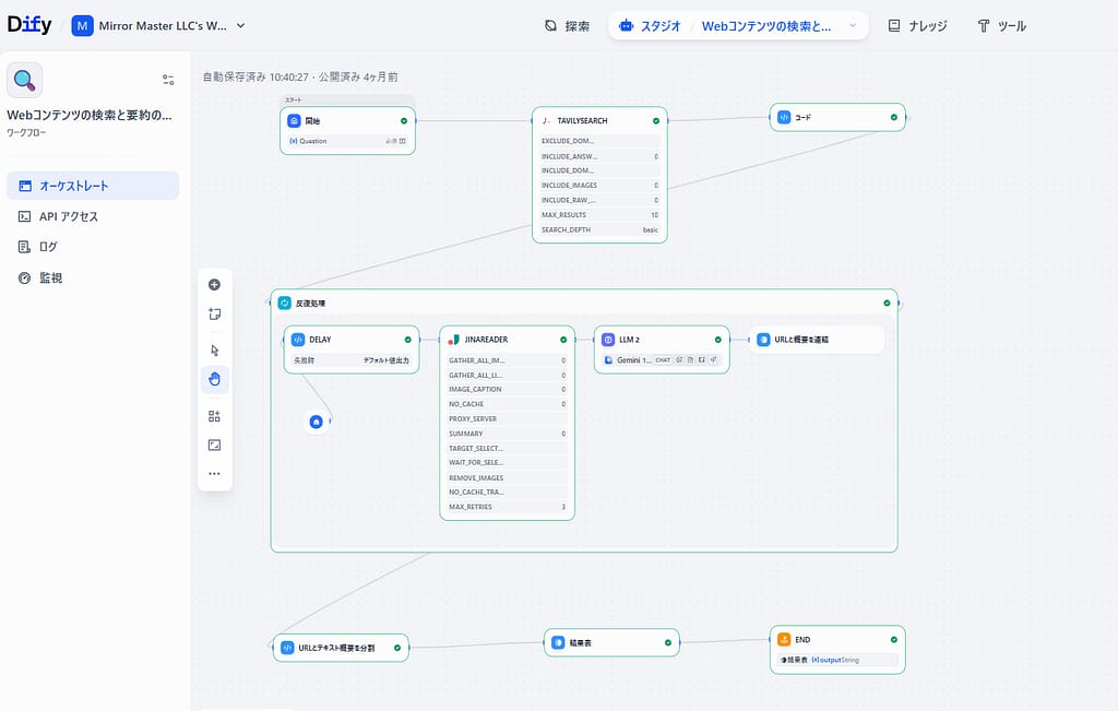「単に検索結果を並べるだけでなく、情報の空白(Knowledge Gap)を自ら見つけ出し、納得いくまで調査を続けるAIが欲しい」 Difyの「Research Agent Process Flow(調査エージェントのプロセスフロー)」は、そんな要望に応える高度なリサーチ自動化テンプ... -
