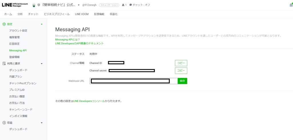 一度LINEの設定に戻ります。LINE Official Account Managerの設定画面(またはDevelopers画面)で、先ほどコピーしたURLを「Webhook URL」に貼り付け、必ず「利用する」をオンにします。