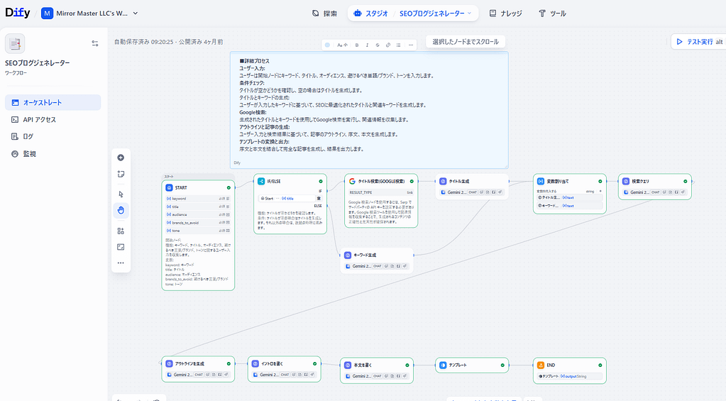 SEO(検索エンジン最適化)に強いブログ記事を書くためには、キーワード選定、競合調査、構成案の作成、そして執筆と、膨大な時間と労力が必要です。 Difyの「SEO Blog Generator(SEOブログジェネレーター)」テンプレートは、指定したキーワードに基づい... -