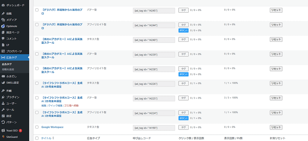 SWELLでは、設置した広告が「何回表示され(PV)」「何回クリックされたか(Click)」、そして「クリック率(CTR)」を自動で計測してくれます。