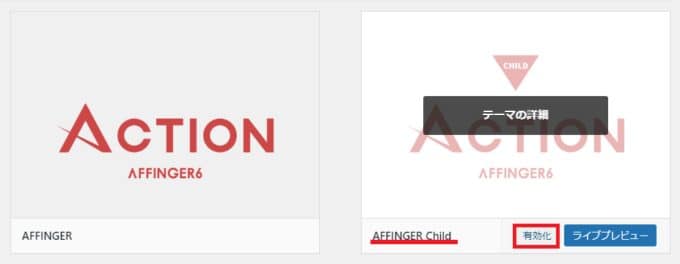 親テーマと子テーマの両方がインストールされたら、必ず「AFFINGER Child」の方の「有効化」ボタンをクリックします。