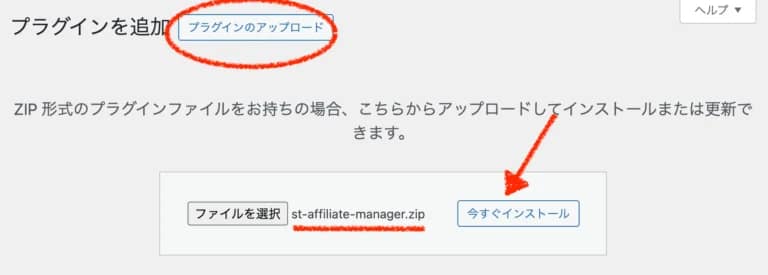 3. 「ファイルを選択」ボタンを押し、先ほど確認した affinger.zip(親テーマ) を選び、「今すぐインストール」をクリックします。